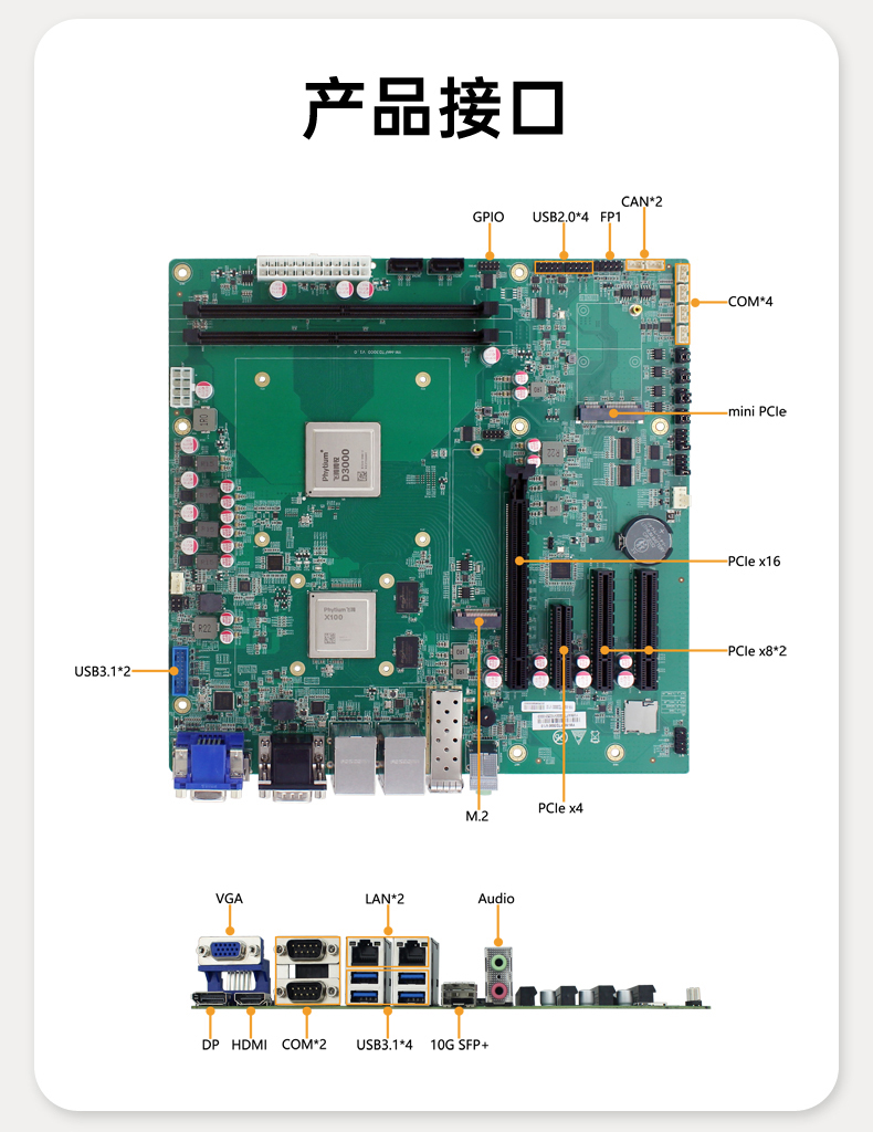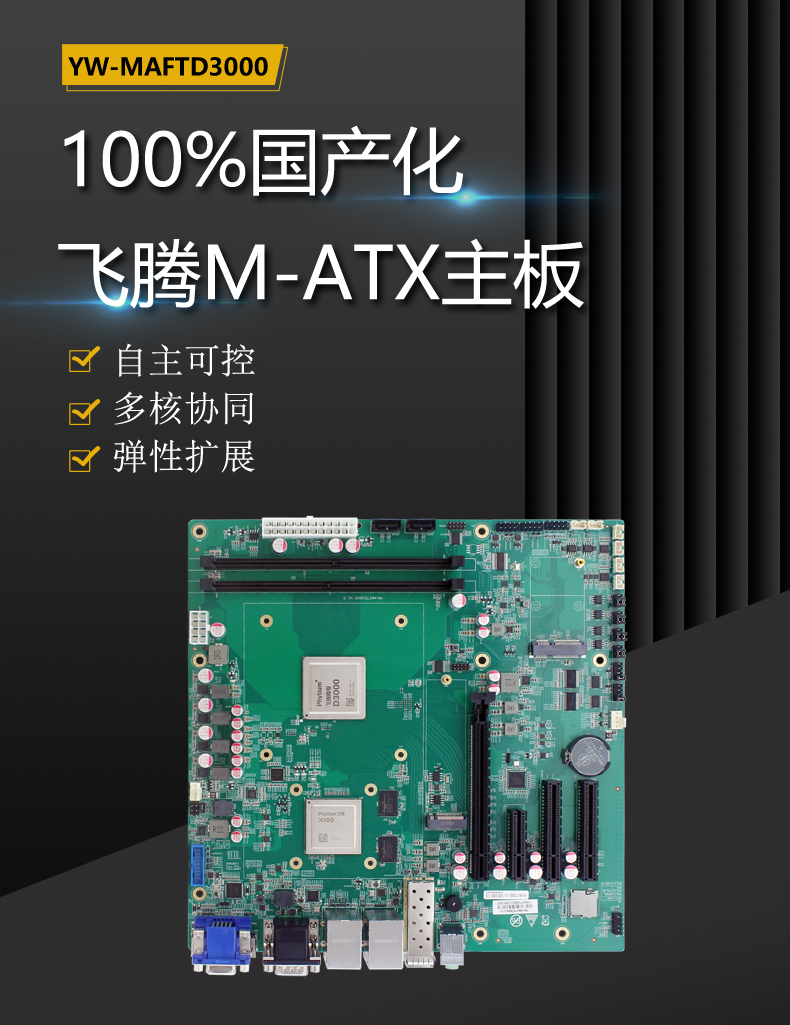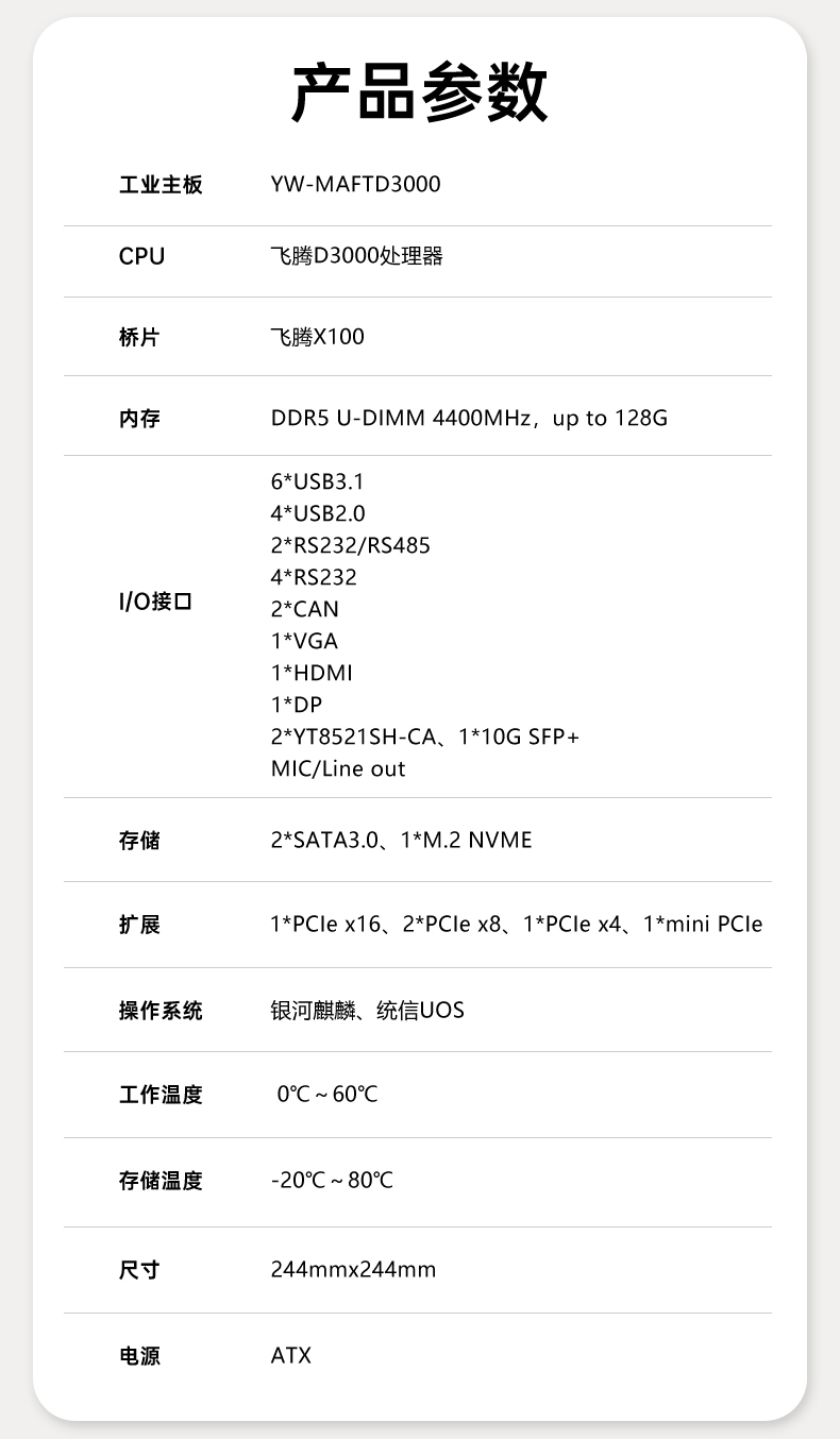 YW-MAFTD3000搭載飛騰D3000處理器和X100橋片,最高128G DDR5 4400MHz內存,滿足高負載計算需求。標準ATX供電,2*RS232/485、4*USB2.0、6*USB3.1、2*CAN、1*10G SFP+,滿足用戶多重連接需求并實現高實時性的數據傳輸和控制,適合多場景應用。